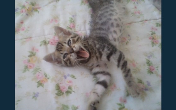 Gato de 9 meses, macho, cinza, branco e preto que usa matacura,